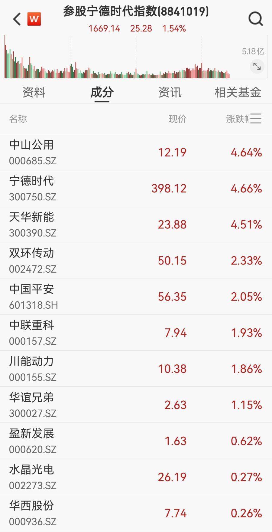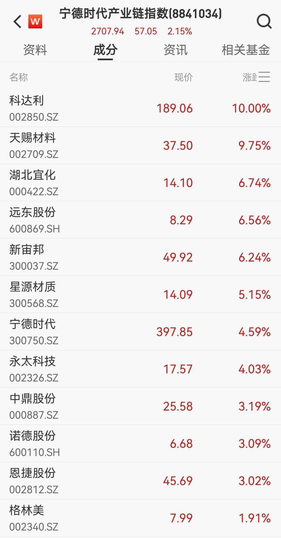 值得注意的是,产业、公司端利好叠加下,产业链相关个股亦股价高涨。宁德时代产业链指数盘中拉升,成分股中科达利10CM涨停,天赐材料涨超9%,湖北宜化、远东股份、新宙邦等涨超6%。此外,参股宁德时代指数中,成分股中山公用、天华新能涨幅居前,均涨超4.5%。