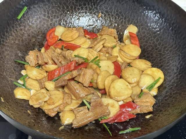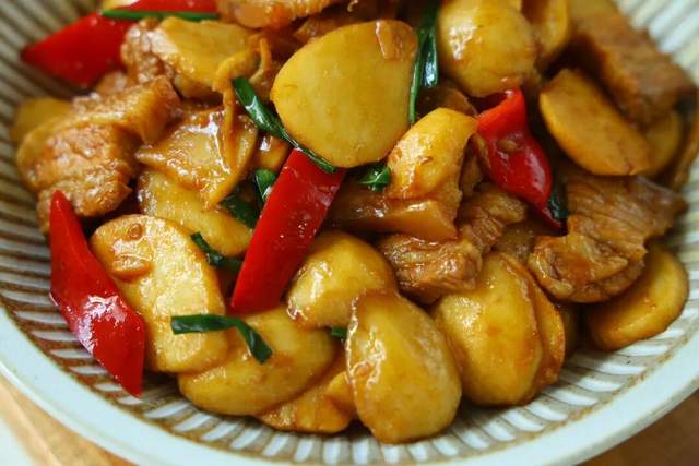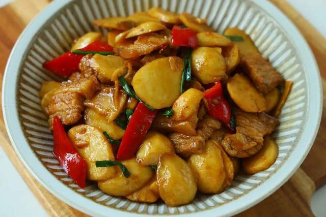 要说茨菇最惹味的搭档,那非得是不可。肥瘦相间的五花肉在锅里慢慢煸出油脂,那个香气啊,直往鼻子里钻!这时候再把茨菇片放进去,让每一片都吸饱肉汁,最后撒上红椒块增色添香,整道菜瞬间就活色生香起来。