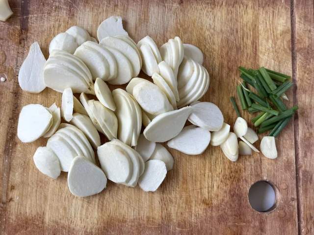 2、茨菇去皮后大御优配,切成薄片,水开下锅焯水2分钟左右,捞出来沥干水分备用;大蒜切片备用、葱段切段备用;